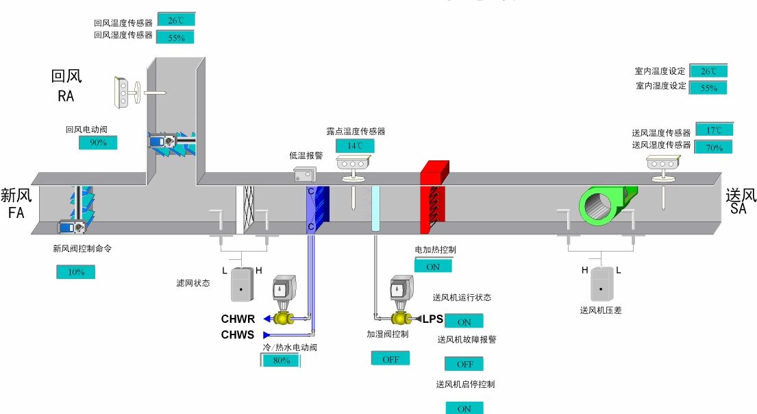 然而,實(shí)際工程中,由于空氣處理中的再熱將抵消一部分冷量,產(chǎn)生再熱負(fù)荷。空氣再熱處理不僅使冷負(fù)荷增大,同時(shí)還需增加加熱量,尤其對(duì)于余熱較小的工程,再熱量比較大,通常設(shè)計(jì)人員無(wú)法心理無(wú)法接受,因而,諸多工程去掉再熱段,采用最大溫差送風(fēng)(露點(diǎn)送風(fēng))。這樣,犧牲了工程的質(zhì)量指標(biāo),使工程相對(duì)濕度難以滿(mǎn)足設(shè)計(jì)要求,尤其在春夏之交,工程內(nèi)的濕度非常大,特別是小余熱工程,以致影響工程的使用。如某地下家具商場(chǎng),采用直接蒸發(fā)式空調(diào)器進(jìn)行空氣處理,并采用露點(diǎn)送風(fēng),工程內(nèi)相對(duì)濕度經(jīng)常超過(guò)80%,梅雨季節(jié),工程內(nèi)異常潮濕,地板有少量凝結(jié)水,并且風(fēng)口有結(jié)露現(xiàn)象,此時(shí)空調(diào)效果很差,用戶(hù)無(wú)所適從,影響工程的正常使用。