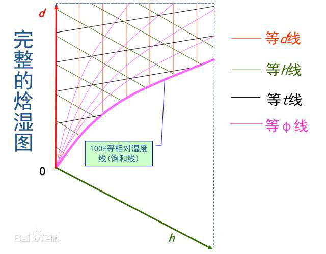 以比焓h-縱坐標(biāo),以含濕量d-橫坐標(biāo),表示大氣壓力B一定時(shí)濕空氣各個(gè)參數(shù)之間的關(guān)系。包含五種線群: