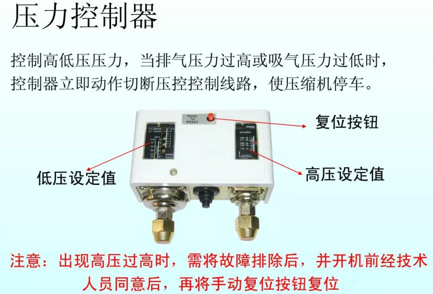 機械式壓力控制器屬于制冷機組壓力的控制的元器件,在制冷系統(tǒng)中主要用作高壓/低壓/高低壓壓力控制器。使用方法簡單,在壓力控制器上面設(shè)定一個壓力,以高于或者低于此壓力的壓力控制器觸點動作,然后可以發(fā)出信號以保護制冷壓縮機為主。