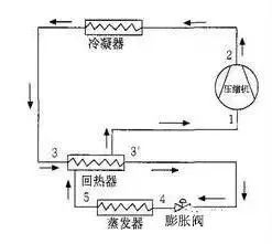 同時(shí)也加熱了回氣管的溫度,避免壓縮機(jī)吸入過潮蒸汽而可能產(chǎn)生液擊。毛細(xì)管節(jié)流的系統(tǒng),毛細(xì)管與回氣管(吸氣管)合并在一起走,有合焊在一起的(大金VRV就是采用的此種方法),有用熱膠套套在一起的,有從回氣管中穿過的,還有纏繞在回氣管上的,也有的將毛細(xì)管或供液管直接在箱體內(nèi)通過。毛細(xì)管與回氣管進(jìn)行熱交換,使節(jié)流前的液態(tài)制冷劑與回氣管道中的低溫制冷劑蒸汽進(jìn)行熱交換冷卻而得到過冷,這樣既可減少回氣管路中可能夾帶的液體液擊壓縮機(jī),同時(shí)又能達(dá)到節(jié)流前液體制冷劑過冷的目的。當(dāng)然還有采用回?zé)崞鞯模硪彩且粯樱?qǐng)參見下圖: