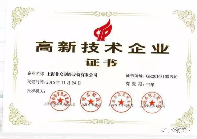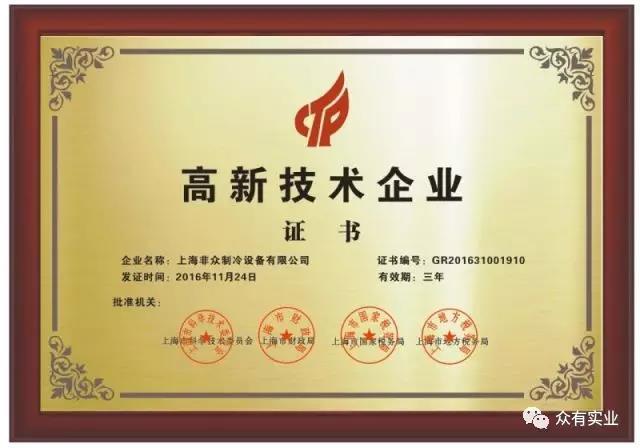 獲得高新技術企業(yè)認證,證明了非眾制冷在本領域中具有較強的技術創(chuàng)新能力、高端技術開發(fā)能力。