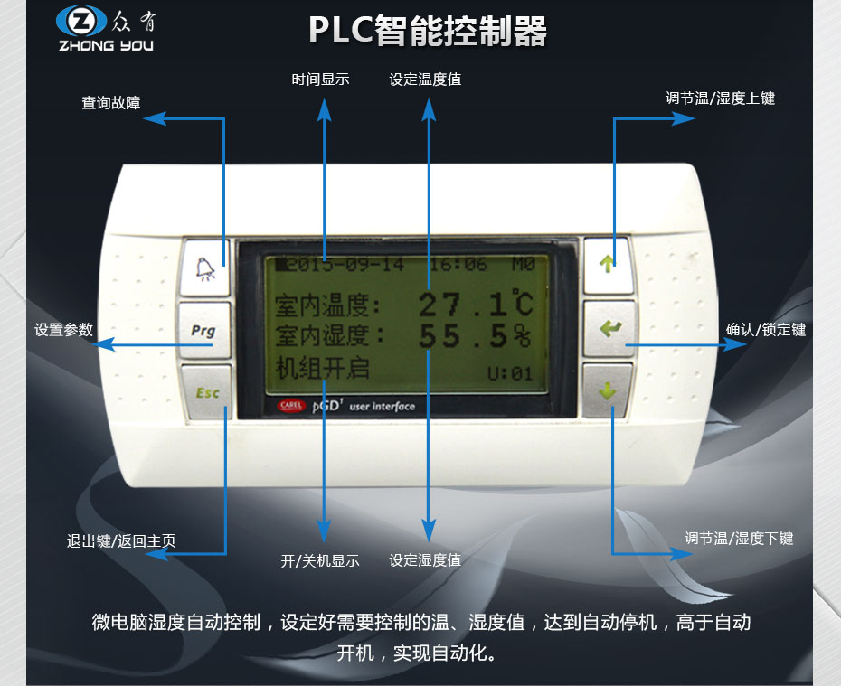 3、高性能電子電極加濕器:不滋生細菌,對室內(nèi)空氣無污染;對水質(zhì)無特殊要求,無需水處理;獨立加濕器控制板,自動定時換水清洗,延長使用壽命,能自動根據(jù)加濕要求控制水位及加濕電極電流,實現(xiàn)高精度控制,真正滿足高精度要求;