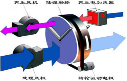 當處理空氣通過轉(zhuǎn)輪的處理區(qū)域時,其中的水蒸汽被轉(zhuǎn)輪中的吸濕介質(zhì)所吸附,水蒸氣同時發(fā)生相變,變?yōu)橐簯B(tài)水,并釋放出潛熱;這時,處理空氣因自身的水份減少而變成干空氣;之后,處理空氣由處理風機送出,變成干的、熱的空氣。
